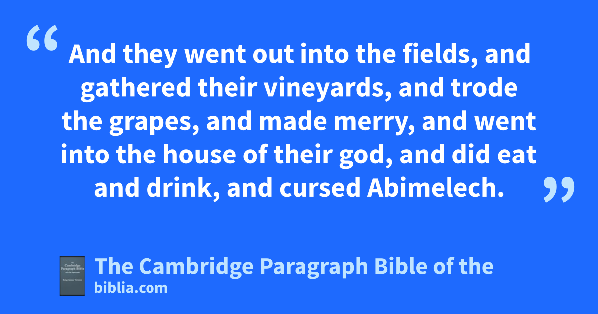 22 * When Abimelech had reigned three years over Israel, 23 then eGod sent an evil spirit between Abimelech and the men of Shechem; and the men of Shechem fdealt treacherously with Abimelech: 24 gthat the cruelty done to the threescore and ten sons of Jerubbaal might come, and their blood be laid upon Abimelech their brother, which slew them; and upon the men of Shechem, which * aided him in the killing of his brethren. 25 And the men of Shechem set liers in wait for him in the top of the mountains, and they robbed all that came along that way by them: and it was told Abimelech. 26 And Gaal the son of Ebed came with his brethren, and went over to Shechem: and the men of Shechem put their confidence in him. 27 And they went out into the fields, and gathered their vineyards, and trode the grapes, and made * merry, and went into hthe house of their god, and did eat and drink, and cursed Abimelech. 28 And Gaal the son of Ebed said, iWho is Abimelech, and who is Shechem, that we should serve him? is not he the son of Jerubbaal? and Zebul his officer? serve the men of jHamor the father of Shechem: for why should we serve him? 29 And kwould to God this people were under my hand; then would I remove Abimelech. And he said to Abimelech, Increase thine army, and come out. 30 And when Zebul the ruler of the city heard the words of Gaal the son of Ebed, his anger was * kindled. 31 And he sent messengers unto Abimelech * privily, saying, Behold, Gaal the son of Ebed and his brethren be come to Shechem; and behold, they fortify the city against thee. 32 Now therefore up by night, thou and the people that is with thee, and lie in wait in the field: 33 and it shall be, that in the morning, as soon as the sun is up, thou shalt rise early, and set upon the city: and behold, when he and the people that is with him come out against thee, then mayest thou do to them * as thou shalt find occasion. 34 And Abimelech rose up, and all the people that were with him, by night, and they laid wait against Shechem in four companies. 35 And Gaal the son of Ebed went out, and stood in the entering of the gate of the city: and Abimelech rose up, and the people that were with him, from lying in wait. 36 And when Gaal saw the people, he said to Zebul, Behold, there come people down from lthe top of the mountains. And Zebul said unto him, Thou seest the shadow of the mountains as if they were men. 37 And Gaal spake again and said, See there come people down by the * middle of the land, and another company come along by mthe plain of * Meonenim. 38 Then said Zebul unto him, Where is now thy mouth, wherewith thou saidst, nWho is Abimelech, that we should serve him? is not this the people that thou hast despised? go out, I pray now, and fight with them. 39 And Gaal went out before the men of Shechem, and fought with Abimelech. 40 And Abimelech chased him, and he fled before him, and many were overthrown and wounded, even unto the entering of the gate. 41 And Abimelech dwelt at Arumah: and Zebul thrust out Gaal and his brethren, that they should not dwell in Shechem. 42 And it came to pass on the morrow, that the people went out into the field; and they told Abimelech. 43 And he took the people, and divided them into three companies, and laid wait in the field, and looked, and behold, the people were come forth out of the city; and he rose up against them, and smote them. 44 And Abimelech, and the company that was with him, orushed forward, and stood in the entering of the gate of the city: and the two other companies oran upon all the people that were in the fields, and slew them. 45 And Abimelech fought against the city all that day; and he took the city, and slew the people that was therein, and pbeat down the city, and sowed it with qsalt. 46 And when all the men of the rtower of Shechem heard that, they entered into a shold of the house tof the god Berith. 47 And it was told Abimelech, that all the men of the rtower of Shechem were gathered together. 48 And Abimelech gat him up to mount uZalmon, he and all the people that were with him; and Abimelech took an axe in his hand, and cut down a bough from the trees, and took it, and laid it on his shoulder, and said unto the people that were with him, What ye have seen * me do, make haste, and do as I have done. 49 And all the people likewise cut down every man his bough, and followed Abimelech, and put them to the shold, and set the hold on fire upon them; so that all the men of the stower of Shechem died also, about a thousand men and women.