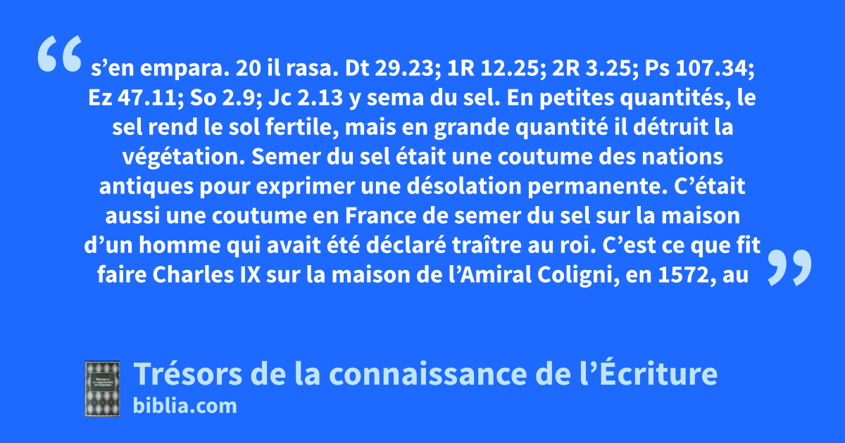 s’en empara. 20 il rasa. Dt 29.23; 1R 12.25; 2R 3.25; Ps 107.34; Ez 47.11; So 2.9; Jc 2.13 y sema du sel. En petites quantités, le sel rend le sol fertile, mais en grande quantité il détruit la végétation. Semer du sel était une coutume des nations antiques pour exprimer une désolation permanente. C’était aussi une coutume en France de semer du sel sur la maison d’un homme qui avait été déclaré traître au roi. C’est ce que fit faire Charles IX sur la maison de l’Amiral Coligni, en 1572, au moment du massacre de la St. Barthélemy.