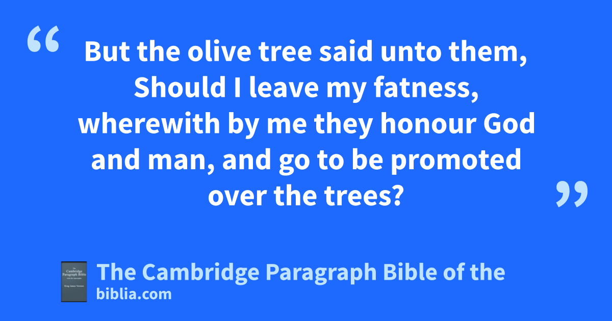 7 And when they told it to Jotham, he went and stood in the top of mmount Gerizim, and lift up his voice, and cried, and said unto them, Hearken unto me, you bmen of Shechem, that God may hearken unto you. 8 nThe trees went forth on a time to anoint a king over them; and they said unto the olive tree, oReign thou over us. 9 But the olive tree said unto them, Should I leave my fatness, pwherewith by me they honour God and man, and * go to be promoted over the trees? 10 And the trees said to the fig tree, Come thou, and reign over us. 11 But the fig tree said unto them, Should I forsake my sweetness, and my good fruit, and go to be promoted over the trees? 12 Then said the trees unto the vine, Come thou, and reign over us. 13 And the vine said unto them, Should I leave my wine, qwhich cheereth God and man, and go to be promoted over the trees? 14 Then said all the trees unto the * bramble, Come thou, and reign over us. 15 And the bramble said unto the trees, If in truth ye anoint me king over you, then come and put your trust in my rshadow: and if not, slet fire come out of the bramble, and devour tthe cedars of Lebanon. 16 Now therefore, if ye have done utruly and sincerely, in that ye have made Abimelech king, and if ye have dealt well with Jerubbaal and his house, and have done unto him according to wthe deserving of his hands; 17 (for my father fought for you, and * adventured his life far, and delivered you out of the hand of Midian: 18 and ye are risen up against my father’s house this day, and xhave slain his sons, threescore and ten persons, upon one stone, and have made Abimelech, ythe son of his maidservant, king over the men of Shechem, zbecause he is your brother;) 19 if ye then have dealt utruly and sincerely with Jerubbaal and with his house this day, then arejoice ye in Abimelech, and let him also rejoice in you: 20 but if not, blet fire come out from Abimelech, and devour cthe men of Shechem, and the house of Millo; and let fire come out from the men of Shechem, and from the house of Millo, and devour Abimelech. 21 And Jotham ran away, and fled, and went to dBeer, and dwelt there, for fear of Abimelech his brother.