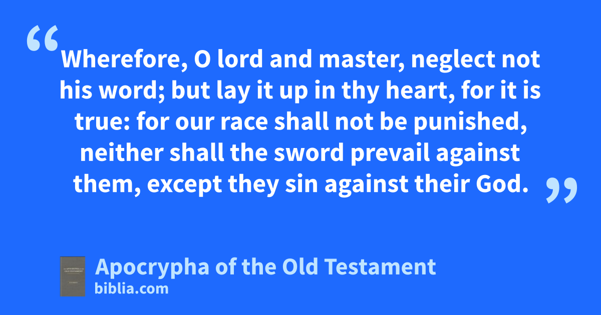 Receive the words of thy servant, and let thy handmaid speak in thy presence, and I will declare no lie unto my lord this night. 6 And if thou shalt follow the words of thy handmaid, God shall bring the thing to pass perfectly with thee; and my lord shall not fail of his purposes. 7 As Nebuchadnezzar king of all the earth liveth, and as his power liveth, who hath sent thee for the preservation of every living thing, not only do men serve him by thee, but also the beasts of the field and the cattle and the birds of the heaven shall live through thy strength, in the time of Nebuchadnezzar and of all his house. 8 For we have heard of thy wisdom and the subtil devices of thy soul, and it hath been reported in all the earth, that thou only art brave in all the kingdom, and mighty in knowledge, and wonderful in feats of war. 9 And now as concerning the matter, which Achior did speak in thy council, we have heard his words: for the men of Bethulia saved him, and he declared unto them all that he had spoken before thee. 10 Wherefore, O lord and master, neglect not his word; but lay it up in thy heart, for it is true: for our race shall not be punished, neither shall the sword prevail against them, except they sin against their God. 11 And now, that my lord be not defeated and frustrate of his purpose, and that death may fall upon them, their sin hath overtaken them, wherewith they shall provoke their God to anger, whensoever they shall do wickedness. 12 Since their victuals failed them, and all their water was scant, they took counsel to lay hands upon their cattle, and determined to consume all those things, which God charged them by his laws that they should not eat: 13 and they are resolved to spend the firstfruits of the corn, and the tenths of the wine and the oil, which they had sanctified, and reserved for the priests that stand before the face of our God in Jerusalem; the which things it is not fitting for any of the people so much as to touch with their hands. 14 And they have sent some to Jerusalem, because they also that dwell there have done this thing, to bring them a licence from the senate. 15 And it shall be, when one shall bring them word, and they shall do it, they shall be given thee to be destroyed the same day. 16 Wherefore I thy servant, knowing all this, fled away from their presence; and God sent me to work things with thee, whereat all the earth shall be astonished, even as many as shall hear it. 17 For thy servant is religious, and serveth the God of heaven day and night: and now, my lord, I will abide with thee, and thy servant will go forth by night into the valley, and I will pray unto God, and he shall tell me when they have committed their sins: 18 and I will come and shew it also unto thee; and thou shalt go forth with all thy host, and there shall be none of them that shall resist thee. 19 And I will lead thee through the midst of Judæa, until thou comest over against Jerusalem; and I will set thy seat in the midst thereof; and thou shalt drive them as sheep that have no shepherd, and a dog shall not so much as open his mouth before thee: for these things were told me according to my foreknowledge, and were declared unto me, and I was sent to tell thee.