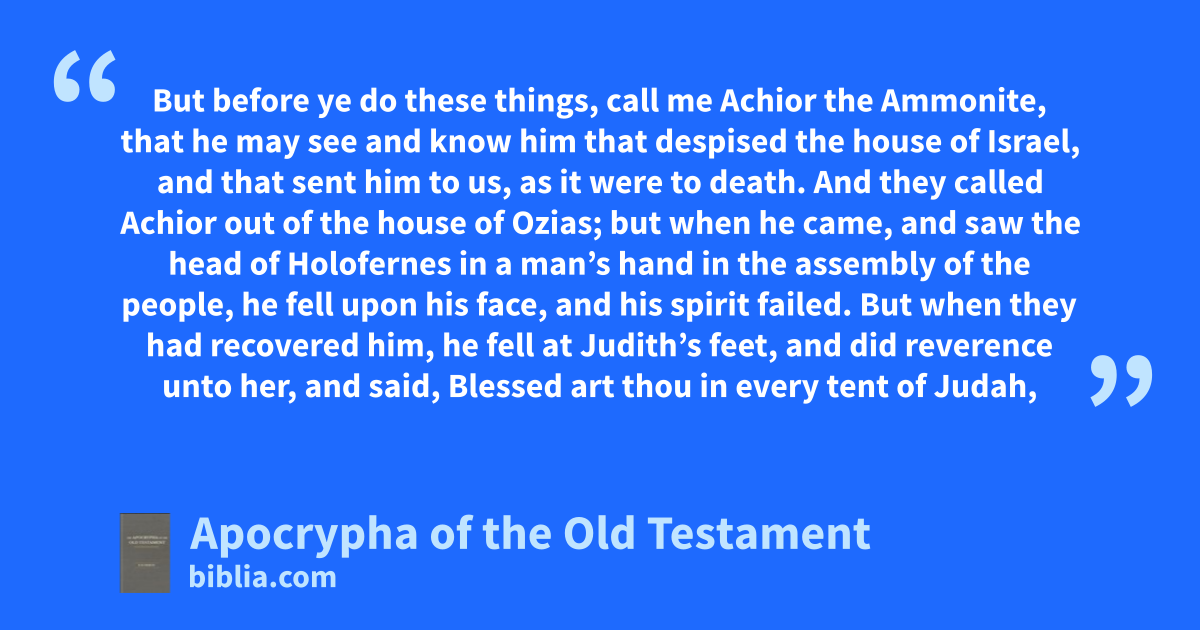 6 And they called Achior out of the house of Ozias; but when he came, and saw the head of Holofernes in a man’s hand in the assembly of the people, he fell upon his face, and his spirit failed. 7 But when they had recovered him, he fell at Judith’s feet, and did reverence unto her, and said, Blessed art thou in every tent of Judah, and in every nation, which hearing thy name shall be troubled. 8 And now tell me all the things that thou hast done in these days. And Judith declared unto him in the midst of the people all the things that she had done, from the day that she went forth until the time that she spake unto them. 9 But when she left off speaking, the people shouted with a loud voice, and made a joyful noise in their city. 10 But when Achior saw all the things that the God of Israel had done, he believed in God exceedingly, and circumcised the flesh of his foreskin, and was joined unto the house of Israel, unto this day.