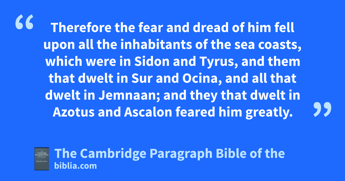 14 Then Olofernes went forth from the presence of his lord, and called all the hgovernors and captains, and the officers of the army of Assur; 15 and he mustered the chosen men for the ibattle, as his lord had commanded him, junto an hundred and twenty thousand, and twelve thousand archers on horseback; 16 and he ranged them, as a great army is ordered for the war. 17 And he took jjcamels and asses for their kcarriages, a very great number; and sheep and oxen and goats without number for their provision: 18 and plenty of victual for every man of the army, and very much gold and silver out of the king’s house. 19 Then he went forth and all his power to go before king Nabuchodonosor in the voyage, and lto cover all the face of the earth westward with their chariots, and horsemen, and their chosen footmen. 20 A great multitude also mof sundry countries came with them like nlocusts, and olike the sand of the earth: for the multitude was without number. 21 And they went forth of Nineve three days’ journey toward the plain of Bectileth, and pitched from Bectileth near the mountain which is at the left hand of the upper pCilicia. 22 Then he took all his army, his footmen, and horsemen, and chariots, and went from thence into the hill country; 23 and destroyed qPhud and qLud, and spoiled all the children of Rasses, and rthe children of Ismael, which were toward the wilderness at the south of the land of the sChellians. 24 Then he went over Euphrates, and went through tMesopotamia, and destroyed all the high cities that were upon the river Arbonai, till you come to the sea. 25 And he took the borders of pCilicia, and killed all that resisted him, and came to uthe borders of Japheth, which were toward the south, over against Arabia. 26 He compassed also all the children of vMadian, and burnt up their tabernacles, and spoiled their sheepcotes. 27 Then he went down into the plain of wDamascus in the time of wheat harvest, and burnt up all their fields, and destroyed their flocks and herds, also he spoiled their cities, and xutterly wasted their countries, and smote all their young men with ythe edge of the sword. 28 Therefore the fear and dread of him fell upon all the inhabitants of the sea coasts, which were in zSidon and Tyrus, and them that dwelt in Sur and Ocina, and all that dwelt in aJemnaan; and they that dwelt in bAzotus and cAscalon feared him greatly.