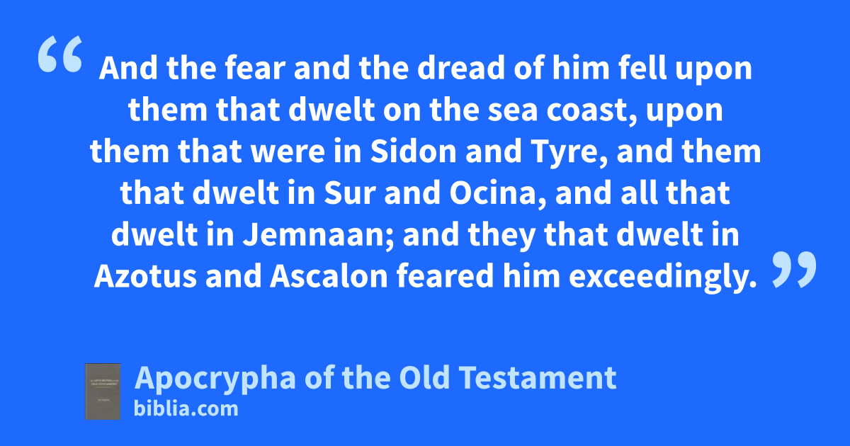 28 And the fear and the dread of him fell upon them that dwelt on the sea coast, upon them that were in Sidon and Tyre, and them that dwelt in Sur and Ocina, and all that dwelt in Jemnaan; and they that dwelt in Azotus and Ascalon feared him exceedingly.