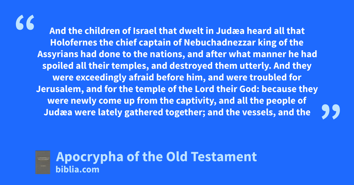 41 And the children of Israel that dwelt in Judæa heard all that Holofernes the chief captain of Nebuchadnezzar king of the Assyrians had done to the nations, and after what manner he had spoiled all their temples, and destroyed them utterly. 2 And they were exceedingly afraid before him, and were troubled for Jerusalem, and for the temple of the Lord their God: 3 because they were newly come up from the captivity, and all the people of Judæa were lately gathered together; and the vessels, and the altar, and the house, were sanctified after the profanation.
