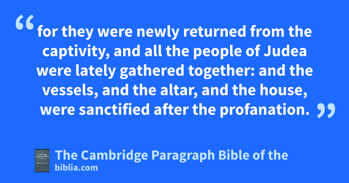 IV. Now the children of Israel, that dwelt in Judea, heard all that Olofernes the chief captain of Nabuchodonosor king of the Assyrians had done to the nations, and after what manner he had spoiled all their temples, and brought them to nought. 2 Therefore they were exceedingly afraid of him, and were troubled for Jerusalem, and for the temple of the Lord their God: 3 afor they were newly returned from the captivity, and all the people * of Judea were lately gathered together: and the vessels, and bthe altar, and bthe house, were sanctified after the profanation. 4 Therefore they sent into all the coasts of cSamaria, and the villages, and to dBethoron, and Belmen, and Jericho, and to eChoba, and Esora, and to the valley of fSalem: 5 and gpossessed themselves beforehand of all the tops of the high mountains, and fortified the villages that were in them, and laid up victuals for the provision of war: for htheir fields were of late reaped. 6 Also iJoacim the high priest, which was in those days in Jerusalem, wrote to them that dwelt in jBethulia, and kBetomestham, which is over against * Esdraelon toward the * open country near to lDothaim, 7 charging them to keep mthe passages of the hill country: for by them there was an entrance into Judea, and it was easy to stop them that would come up, because the passage was strait, * for two men at the most. 8 And the children of Israel did as iJoacim the high priest had commanded them, with the * ancients of all the people of Israel, which dwelt at Jerusalem. 9 Then every man of Israel cried to God with great nfervency, and with great nvehemency did they humble their souls: 10 both they, and their wives, and their children, and their cattle, and every stranger and hireling, and their servants bought with money, oput sackcloth upon their loins. 11 Thus every man and woman, and the little children, and the inhabitants of Jerusalem, pfell before the temple, and qcast ashes upon their heads, and rspread out their sackcloth before the face of the Lord: also they put sackcloth about the altar, 12 and cried to the God of Israel all with one consent earnestly, that he would not give their children for a prey, and their wives sfor a spoil, and the cities of their inheritance to destruction, and the sanctuary to profanation, and reproach, and for the nations to rejoice at. 13 So God heard their prayers, and tlooked upon their afflictions: for the people fasted many days in all Judea and Jerusalem ubefore the sanctuary of the Lord vAlmighty. 14 And iJoacim the high priest, and all the priests that stood before the Lord, and they which ministered unto the Lord, ohad their loins girt with sackcloth, and woffered the daily burnt offerings, with the vows and free gifts of the people, 15 and qhad ashes on their xmitres, and cried unto the Lord with all their power, that he would look upon all the house of Israel graciously.