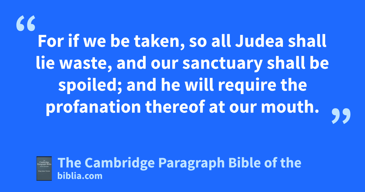 Hear me now, O ye governors of the inhabitants of Bethulia: for your words that you have spoken before the people this day are not right, touching this oath which ye made and pronounced between God and you, and have promised to deliver the city to our enemies, unless within these days the Lord turn to help you. 12 And now who are you qthat have tempted God this day, and stand instead of God amongst the children of men? 13 And now try the Lord rAlmighty, but you shall never know any thing. 14 For syou cannot find the depth of the heart of man, neither can ye perceive the things that he thinketh: then how can you search out God, that hath made all these things, and tknow his mind, or comprehend his purpose? Nay, my brethren, uprovoke not the Lord our God to anger. 15 For if he will not help us within these five days, he hath power to defend us when he will, even every day, or to destroy us before our enemies. 16 Do not * bind the counsels of the Lord our God: for xGod is not as man, that he may be threatened; xneither is he as the son of man, that he should be wavering. 17 Therefore let us wait for salvation of him, and call upon him to help us, and he will hear our voice, if it please him. 18 For there arose none in our age, neither is there any now in these days, neither tribe, nor family, nor * people, nor city, among us, which worship gods made with hands, yas hath been aforetime. 19 For the which cause our fathers were given to the sword, and for a spoil, and had a great fall before our enemies. 20 But we know none other god, therefore we trust that he will not despise us, nor any of our nation. 21 For if we be taken, so all Judea shall lie waste, and our sanctuary shall be spoiled; and he will require the profanation thereof at our mouth. 22 And the * slaughter of our brethren, and the captivity of the country, and the desolation of our inheritance, will he turn upon our heads among the Gentiles, wheresoever we shall be in bondage; and we shall be zan offence and a reproach to all them that possess us. 23 For our servitude shall not be directed to favour: but the Lord our God shall turn it to dishonour. 24 Now therefore, O brethren, let us shew an example to our brethren, because their hearts depend upon us, and the sanctuary, and the house, and the altar, rest upon us. 25 Moreover let us give thanks to the Lord our God, which trieth us, even as he did our fathers. 26 Remember what things he did to aAbraham, and how he tried aIsaac, and bwhat happened to Jacob in Mesopotamia of Syria, when he kept the sheep of Laban his mother’s brother. 27 For he hath not tried us in the fire, as he did them, for the examination of their hearts, neither hath he taken vengeance on us: but cthe Lord doth scourge them that come near unto him, to admonish them.