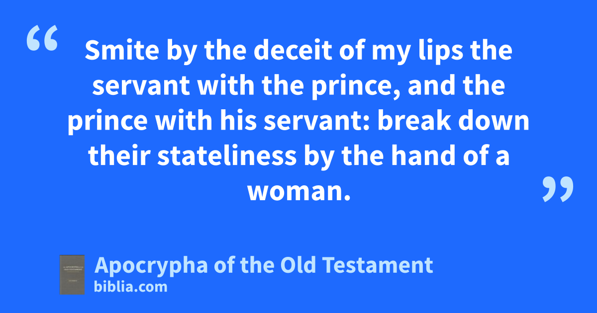 2 O Lord God of my father Simeon, into whose hand thou gavest a sword to take vengeance of the strangers, who loosened the girdle of a virgin to defile her, and uncovered the thigh to her shame, and profaned the womb to her reproach; 3 for thou saidst, It shall not be so; and they did so: wherefore thou gavest their rulers to be slain, and their bed, which was ashamed for her that was deceived, to be dyed in blood, and smotest the servants with their lords, and the lords upon their thrones; 4 and gavest their wives for a prey, and their daughters to be captives, and all their spoils to be divided among thy dear children; which were moved with zeal for thee, and abhorred the pollution of their blood, and called upon thee for aid: O God, O my God, hear me also that am a widow. 5 For thou wroughtest the things that were before those things, and those things, and such as ensued after; and thou didst devise the things which are now, and the things which are to come: 6 and the things which thou didst devise came to pass; yea, the things which thou didst determine stood before thee, and said, Lo, we are here: for all thy ways are prepared, and thy judgement is with foreknowledge. 7 For, behold, the Assyrians are multiplied in their power; they are exalted with horse and rider; they have gloried in the strength of their footmen; they have trusted in shield and spear and bow and sling; and they know not that thou art the Lord that breaketh the battles: the Lord is thy name. 8 Dash thou down their strength in thy power, and bring down their force in thy wrath: for they have purposed to profane thy sanctuary, and to defile the tabernacle where thy glorious name resteth, and to cast down with the sword the horn of thine altar. 9 Look upon their pride, and send thy wrath upon their heads: give into my hand, which am a widow, the might that I have conceived. 10 Smite by the deceit of my lips the servant with the prince, and the prince with his servant: break down their stateliness by the hand of a woman. 11 For thy power standeth not in multitude, nor thy might in strong men: but thou art a God of the afflicted, thou art a helper of the oppressed, an upholder of the weak, a protector of the forlorn, a saviour of them that are without hope. 12 Yea, yea, God of my father, and God of the inheritance of Israel, Lord of the heavens and of the earth, Creator of the waters, King of every creature, hear thou my prayer: 13 and make my speech and deceit to be their wound and stripe, who have purposed hard things against thy covenant, and thy hallowed house, and the top of Sion, and the house of the possession of thy children. 14 And make every nation and tribe of thine to know that thou art God, the God of all power and might, and that there is none other that protecteth the race of Israel but thou.