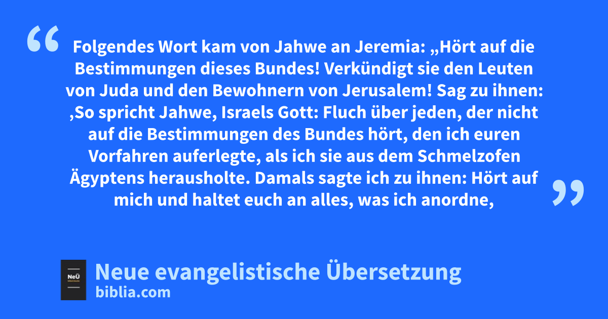 11 1 Folgendes Wort kam von Jahwe an Jeremia: 2 „Hört auf die Bestimmungen dieses Bundes! Verkündigt sie den Leuten von Juda und den Bewohnern von Jerusalem! 3 Sag zu ihnen: ‚So spricht Jahwe, Israels Gott: Fluch über jeden, der nicht auf die Bestimmungen des Bundes hört, 4 den ich euren Vorfahren auferlegte, als ich sie aus dem Schmelzofen Ägyptens herausholte. Damals sagte ich zu ihnen: Hört auf mich und haltet euch an alles, was ich anordne, dann seid ihr mein Volk und ich bin euer Gott. 5 Nur dann kann ich den Eid halten, den ich euren Vorfahren geschworen habe, dass ich ihnen ein Land gebe, das von Milch und Honig überfließt – das Land, in dem ihr heute lebt.‘ “ Ich erwiderte: „Amen1, Jahwe!“