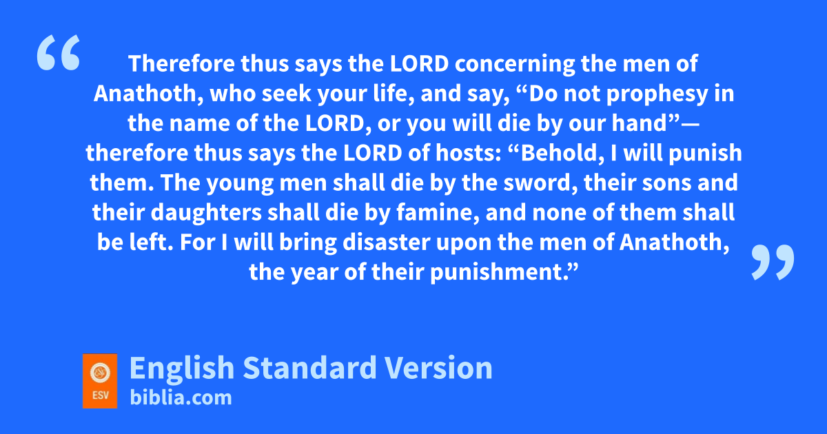 21 Therefore thus says the Lord concerning the men of hAnathoth, iwho seek your life, and say, j“Do not prophesy in the name of the Lord, or you will die by our hand”— 22 therefore thus says the Lord of hosts: “Behold, I will punish them. The young men shall die by the sword, their sons and their daughters shall die by famine, 23 and none of them shall be left. For I will bring disaster upon the men of kAnathoth, lthe year of their punishment.”