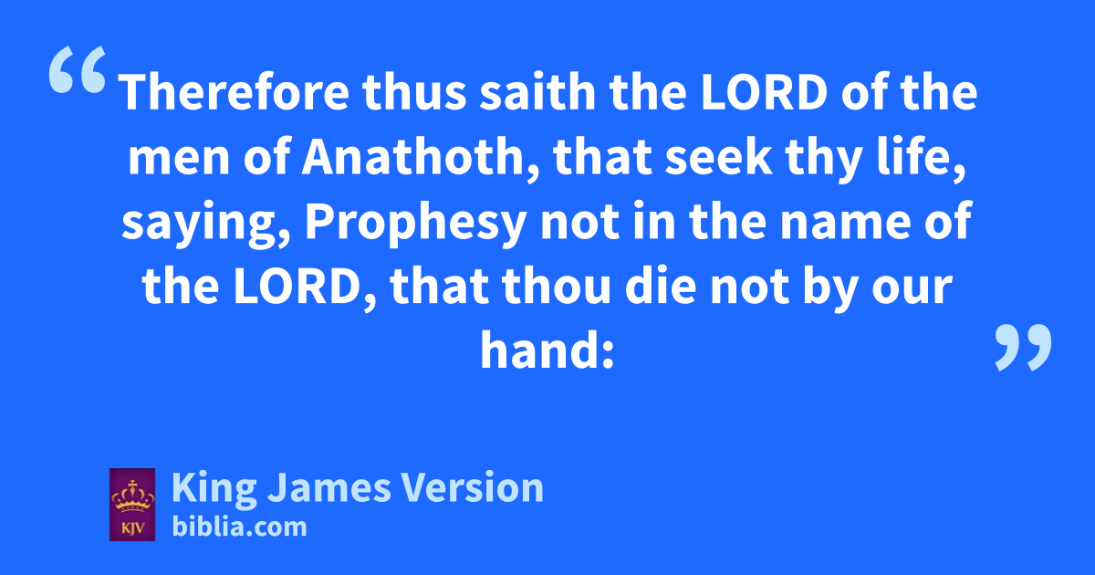 21 Therefore thus saith the Lord of the men of oAnathoth, pthat seek thy life, saying, qProphesy not in the name of the Lord, rthat thou die not by our hand: 22 Therefore thus saith the Lord of hosts, Behold, I will †punish them: the young men shall die by the sword; their sons and their daughters shall die by famine: 23 And there shall be no remnant of them: for sI will bring evil upon the men of oAnathoth, even stthe year of their visitation.