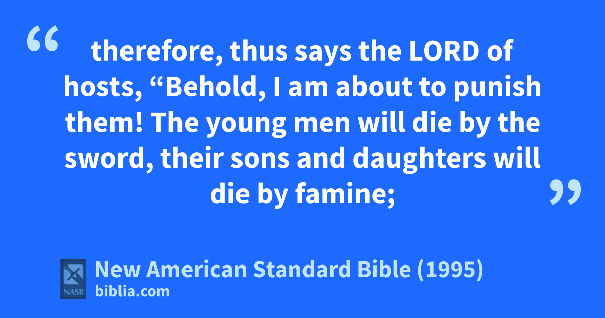 22 therefore, thus says the Lord of hosts, “Behold, I am about to apunish them! The byoung men will die by the sword, their sons and daughters will die by famine;