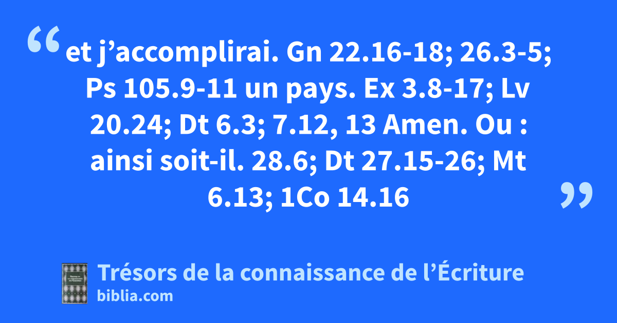 et j’accomplirai. Gn 22.16-18; 26.3-5; Ps 105.9-11 un pays. Ex 3.8-17; Lv 20.24; Dt 6.3; 7.12, 13 Amen. Ou : ainsi soit-il. 28.6; Dt 27.15-26; Mt 6.13; 1Co 14.16