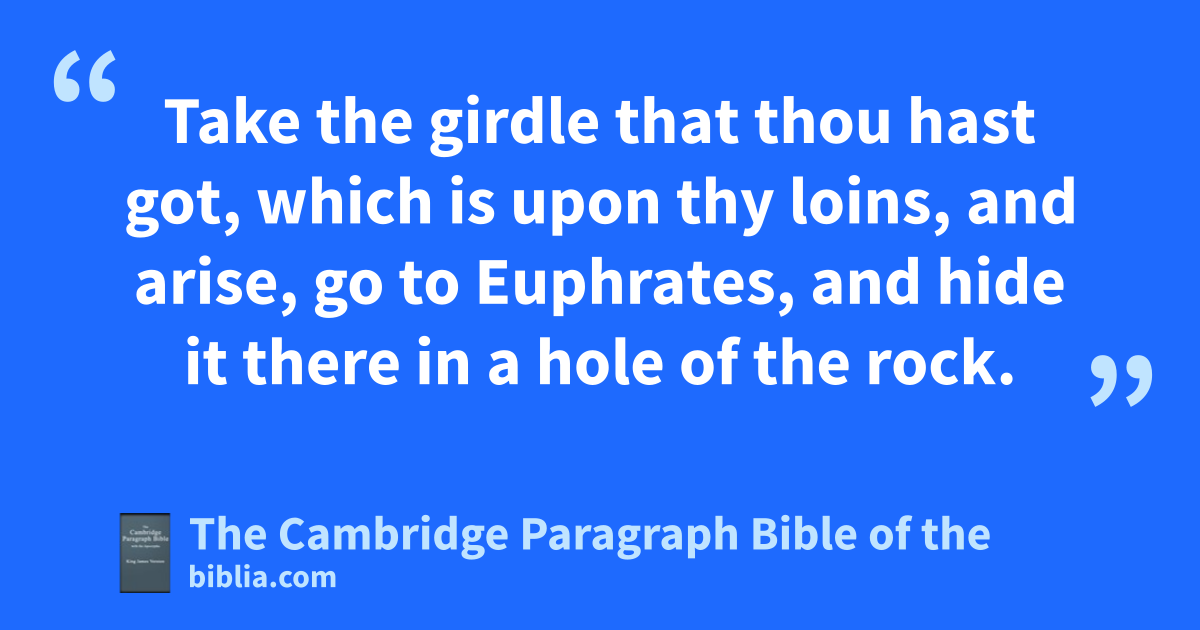 XIII. * Thus saith the Lord unto me, Go and get thee aa linen bgirdle, and put it upon thy loins, and put it not in water. 2 cSo I got a girdle, according to the word of the Lord, and put it on my loins. 3 And the word of the Lord came unto me the second time, saying, 4 Take the girdle that thou hast got, which is upon thy loins, and arise, go to Euphrates, and hide it there in da hole of the rock. 5 So I went, and hid it by Euphrates, as the Lord commanded me. 6 And it came to pass after many days, that the Lord said unto me, Arise, go to Euphrates, and take the girdle from thence, which I commanded thee to hide there. 7 Then I went to Euphrates, and digged, and took the girdle from the place where I had hid it: and behold, the girdle ewas marred, it fwas profitable for nothing. 8 Then the word of the Lord came unto me, saying, 9 Thus saith the Lord, gAfter this manner will I emar hthe pride of Judah, and the great pride of Jerusalem. 10 This evil people, which refuse to hear my words, which iwalk in the * imagination of their heart, and walk after other gods, to serve them, and to worship them, shall even be as this girdle, which fis good for nothing. 11 For as the girdle cleaveth to the loins of a man, so have I caused to cleave unto me the whole house of Israel and the whole house of Judah, saith the Lord; kthat they might be unto me for a people, and lmnfor a name, and lnofor a praise, and lfor a glory: but they would not hear.