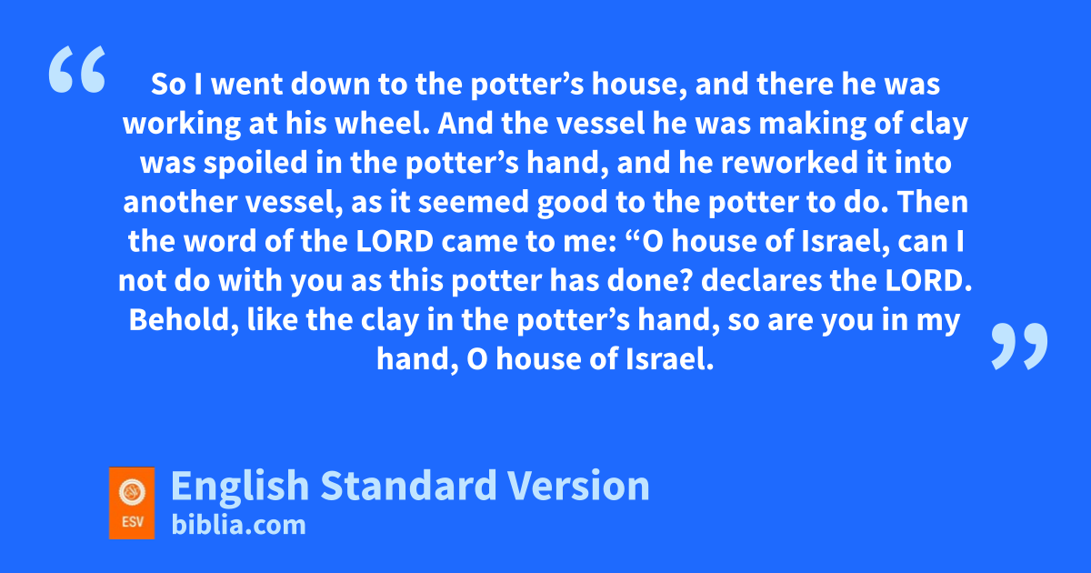 18 The word that came to Jeremiah from the Lord: 2 “Arise, and go down to qthe potter’s house, and there I will let you hear1 my words.” 3 So I went down to rthe potter’s house, and there he was working at his wheel. 4 And the vessel he was making of clay was sspoiled in the potter’s hand, and the reworked it into another vessel, as it seemed good to the potter to do.