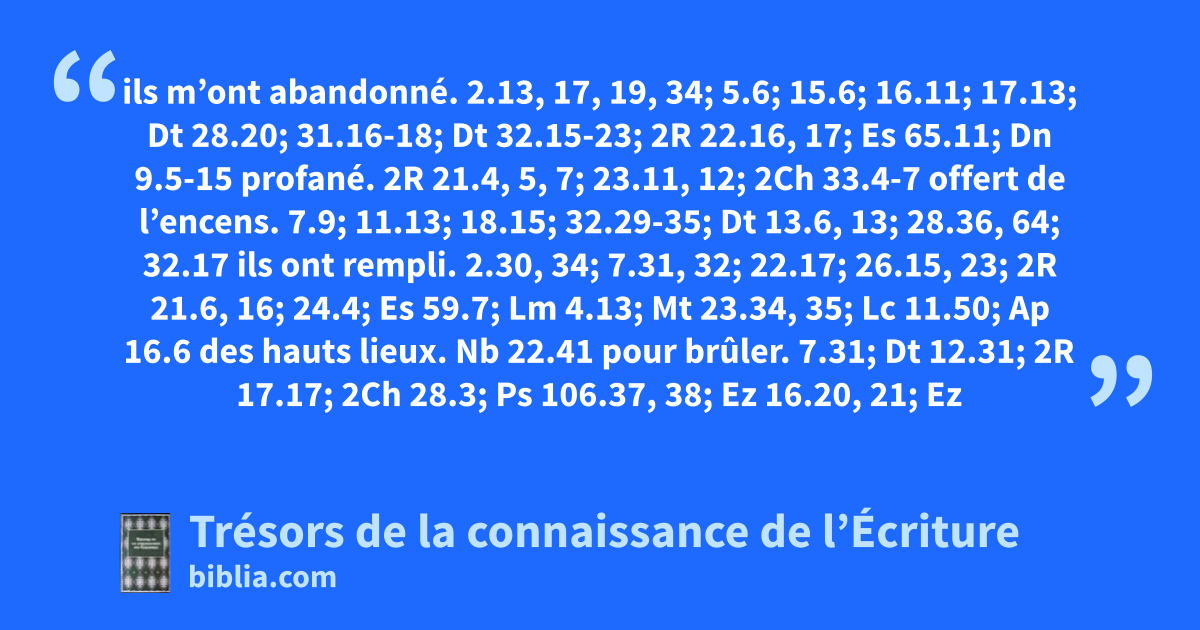 ils m’ont abandonné. 2.13, 17, 19, 34; 5.6; 15.6; 16.11; 17.13; Dt 28.20; 31.16-18; Dt 32.15-23; 2R 22.16, 17; Es 65.11; Dn 9.5-15 profané. 2R 21.4, 5, 7; 23.11, 12; 2Ch 33.4-7 offert de l’encens. 7.9; 11.13; 18.15; 32.29-35; Dt 13.6, 13; 28.36, 64; 32.17 ils ont rempli. 2.30, 34; 7.31, 32; 22.17; 26.15, 23; 2R 21.6, 16; 24.4; Es 59.7; Lm 4.13; Mt 23.34, 35; Lc 11.50; Ap 16.6
