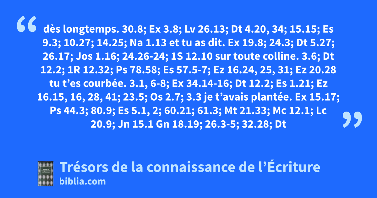 dès longtemps. 30.8; Ex 3.8; Lv 26.13; Dt 4.20, 34; 15.15; Es 9.3; 10.27; 14.25; Na 1.13 et tu as dit. Ex 19.8; 24.3; Dt 5.27; 26.17; Jos 1.16; 24.26-24; 1S 12.10 sur toute colline. 3.6; Dt 12.2; 1R 12.32; Ps 78.58; Es 57.5-7; Ez 16.24, 25, 31; Ez 20.28 tu t’es courbée. 3.1, 6-8; Ex 34.14-16; Dt 12.2; Es 1.21; Ez 16.15, 16, 28, 41; 23.5; Os 2.7; 3.3