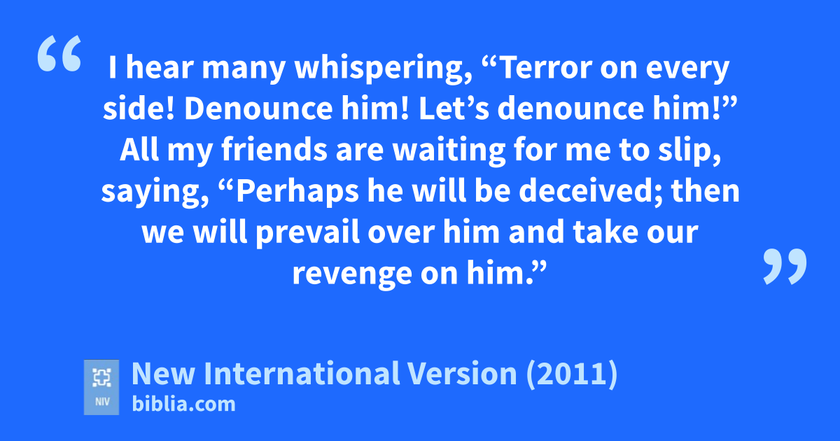 20 When the priest Pashhur son of Immer,v the officialw in charge of the temple of the Lord, heard Jeremiah prophesying these things, 2 he had Jeremiah the prophet beatenx and put in the stocksy at the Upper Gate of Benjaminz at the Lord’s temple. 3 The next day, when Pashhur released him from the stocks, Jeremiah said to him, “The Lord’s namea for you is not Pashhur, but Terror on Every Side.b 4 For this is what the Lord says: ‘I will make you a terror to yourself and to all your friends; with your own eyesc you will see them fall by the sword of their enemies. I will gived all Judah into the hands of the king of Babylon, who will carrye them away to Babylon or put them to the sword. 5 I will deliver all the wealthf of this city into the hands of their enemies—all its products, all its valuables and all the treasures of the kings of Judah. They will take it awayg as plunder and carry it off to Babylon. 6 And you, Pashhur, and all who live in your house will go into exile to Babylon. There you will die and be buried, you and all your friends to whom you have prophesiedh lies.’ ”