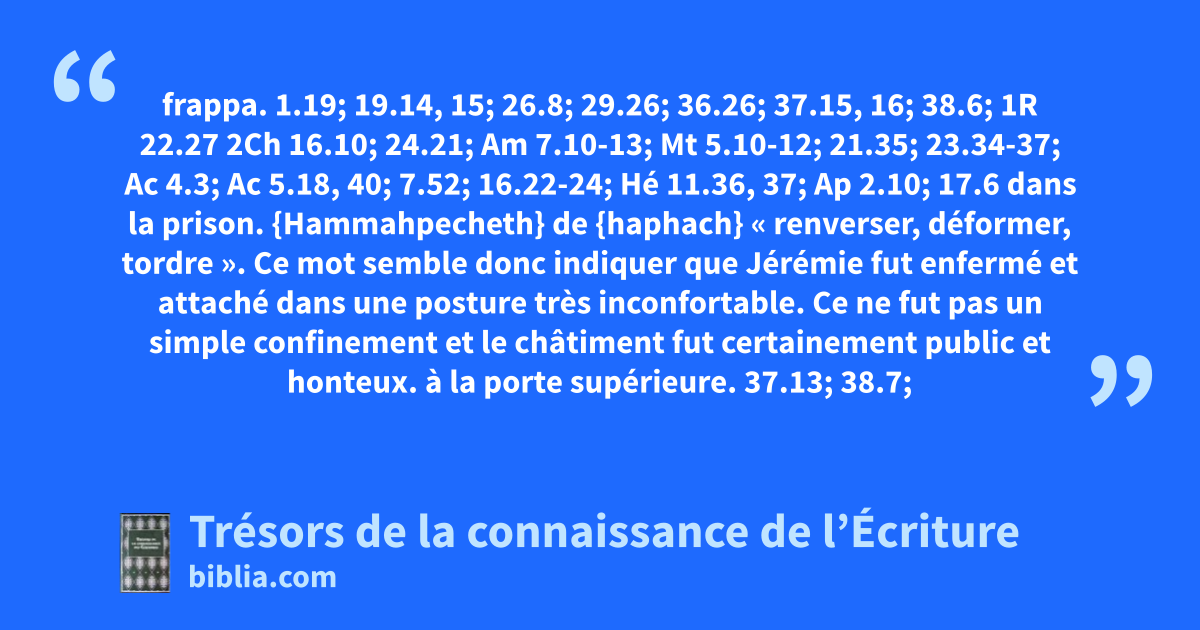 frappa. 1.19; 19.14, 15; 26.8; 29.26; 36.26; 37.15, 16; 38.6; 1R 22.27 2Ch 16.10; 24.21; Am 7.10-13; Mt 5.10-12; 21.35; 23.34-37; Ac 4.3; Ac 5.18, 40; 7.52; 16.22-24; Hé 11.36, 37; Ap 2.10; 17.6 dans la prison. {Hammahpecheth} de {haphach} « renverser, déformer, tordre ». Ce mot semble donc indiquer que Jérémie fut enfermé et attaché dans une posture très inconfortable. Ce ne fut pas un simple confinement et le châtiment fut certainement public et honteux. à la porte supérieure. 37.13; 38.7; Za 14.10
