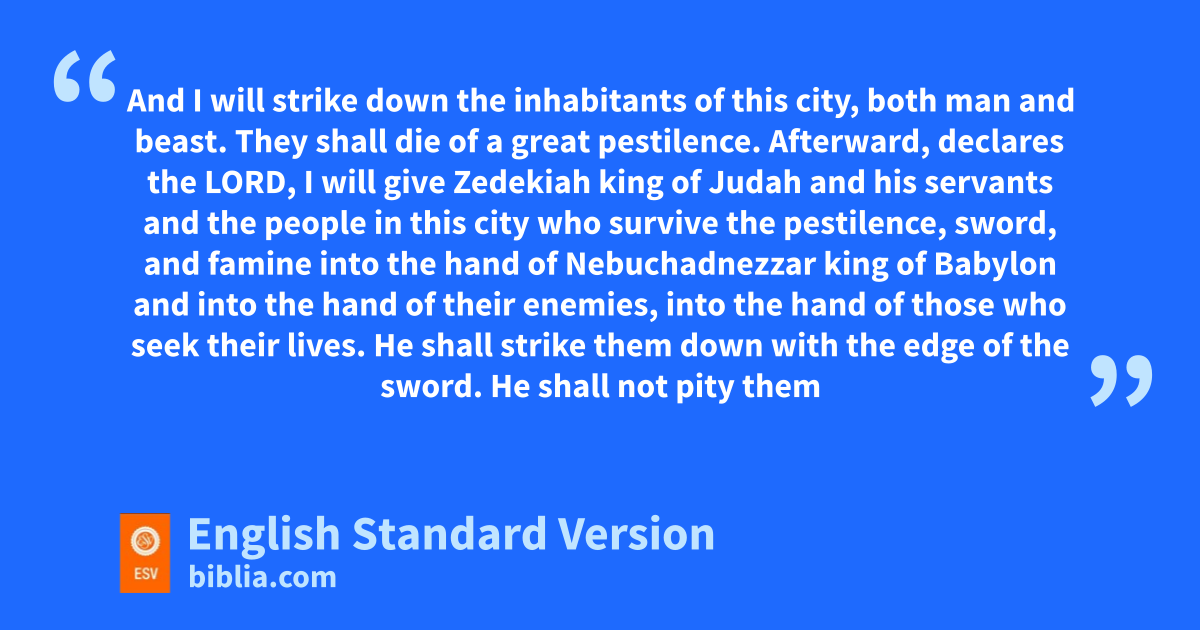 3 Then Jeremiah said to them: “Thus you shall say to Zedekiah, 4 ‘Thus says the Lord, the God of Israel: aBehold, I will turn back the weapons of war that are in your hands and with which you are fighting against the king of Babylon and against the Chaldeans who are besieging you outside the walls. bAnd I will bring them together into the midst of this city. 5 I myself will fight against you cwith outstretched hand and strong arm, din anger and in fury and in great wrath. 6 And I will strike down the inhabitants of this city, both man and beast. They shall die of a great pestilence. 7 Afterward, declares the Lord, eI will give Zedekiah king of Judah and his servants and the people in this city who survive the pestilence, sword, and famine into the hand of Nebuchadnezzar king of Babylon and into the hand of their enemies, into the hand of those who seek their lives. He shall strike them down with the edge of the sword. fHe shall not pity them or spare them or have compassion.’