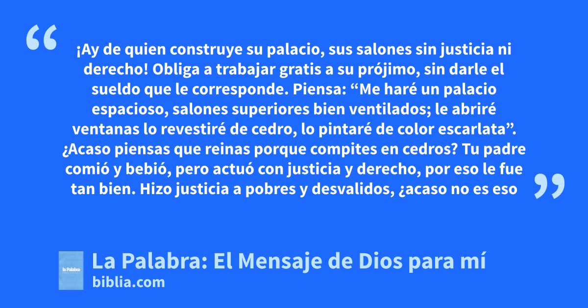 — Baja al palacio del rey de Judá y comunícale lo siguiente. 2 Le dirás: “Escucha la palabra del Señor, rey de Judá, tú que te sientas en el trono de David; y que la escuchen también tus cortesanos y tu pueblo, que entran por estas puertas. 3 Así dice el Señor: Actúen conforme a derecho y justicia, liberen al desposeído de manos del opresor, no exploten ni traten con violencia al inmigrante, al huérfano y a la viuda, ni derramen sangre inocente en este lugar. 4 Si ponen en práctica todo esto, entrarán por las puertas de este palacio reyes que se sentarán en el trono de David; lo harán montados en carros y caballos, junto con sus cortesanos y su séquito. 5 Pero si no escuchan estas palabras, lo juro por mí mismo —oráculo del Señor— que convertiré en ruinas este palacio”.