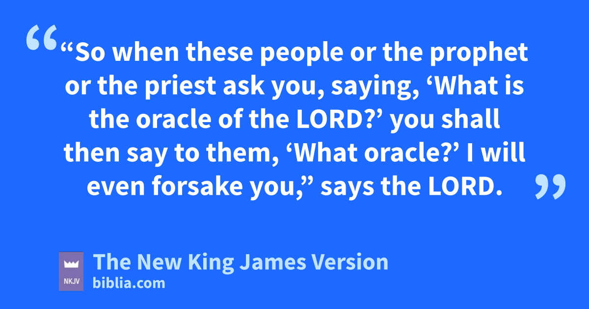 33 “So when these people or the prophet or the priest ask you, saying, ‘What is tthe 8oracle of the Lord?’ you shall then say to them, 9‘What oracle?’ I will even forsake you,” says the Lord. 34 “And as for the prophet and the priest and the people who say, ‘The 1oracle of the Lord!’ I will even punish that man and his house. 35 Thus every one of you shall say to his neighbor, and every one to his brother, ‘What has the Lord answered?’ and, ‘What has the Lord spoken?’ 36 And the 2oracle of the Lord you shall mention no more. For every man’s word will be his oracle, for you have uperverted the words of the living God, the Lord of hosts, our God. 37 Thus you shall say to the prophet, ‘What has the Lord answered you?’ and, ‘What has the Lord spoken?’ 38 But since you say, ‘The 3oracle of the Lord!’ therefore thus says the Lord: ‘Because you say this word, “The oracle of the Lord!” and I have sent to you, saying, “Do not say, ‘The oracle of the Lord!’ ” 39 therefore behold, I, even I, vwill utterly forget you and forsake you, and the city that I gave you and your fathers, and will cast you out of My presence. 40 And I will bring wan everlasting reproach upon you, and a perpetual xshame, which shall not be forgotten.’ ”