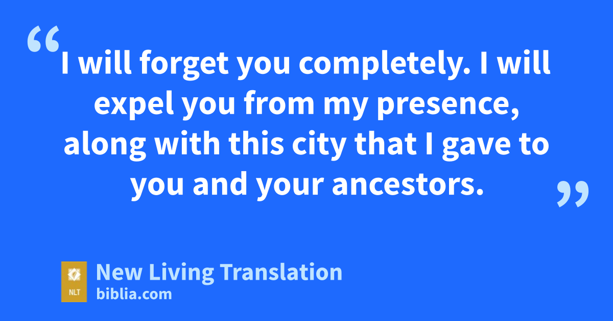 37 “This is what you should say to the prophets: ‘What is the Lord’s answer?’ or ‘What is the Lord saying?’ 38 But suppose they respond, ‘This is a prophecy from the Lord!’ Then you should say, ‘This is what the Lord says: Because you have used this phrase, “prophecy from the Lord,” even though I warned you not to use it, 39 I will forget you completely.* I will expel you from my presence, along with this city that I gave to you and your ancestors. 40 And I will make you an object of ridicule, and your name will be infamous throughout the ages.’ ”