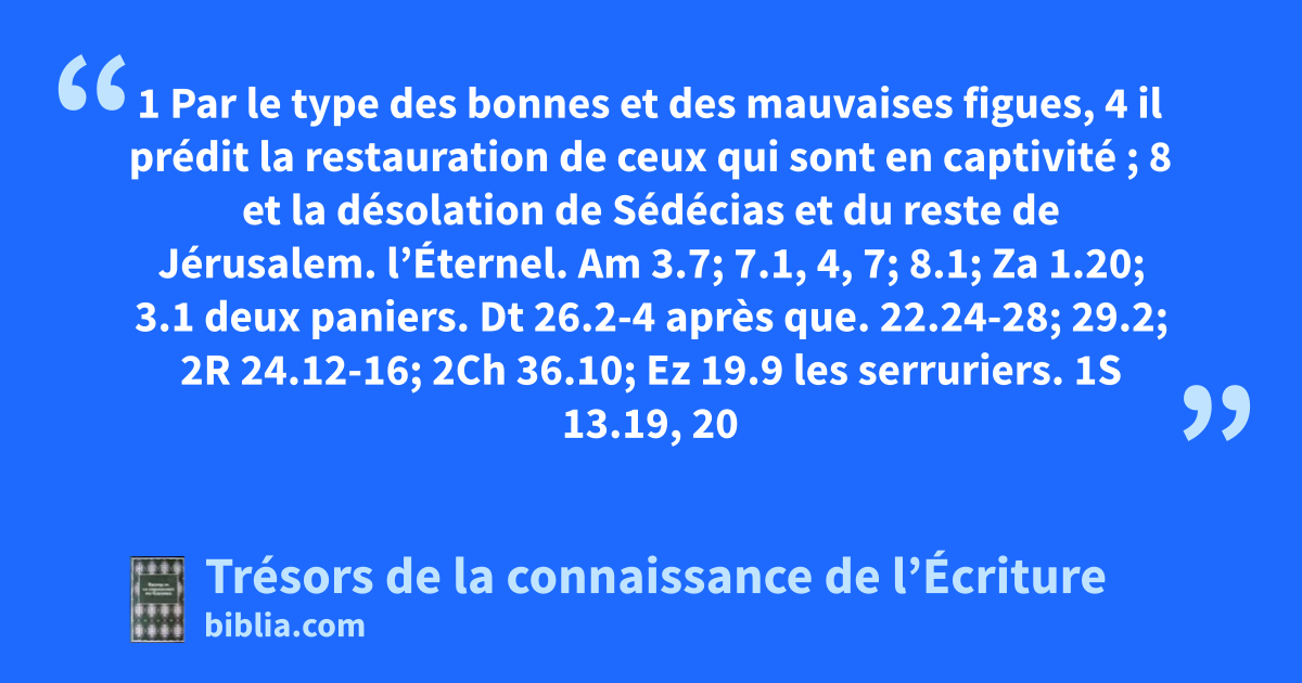 l’Éternel. Am 3.7; 7.1, 4, 7; 8.1; Za 1.20; 3.1 deux paniers. Dt 26.2-4 après que. 22.24-28; 29.2; 2R 24.12-16; 2Ch 36.10; Ez 19.9 les serruriers. 1S 13.19, 20