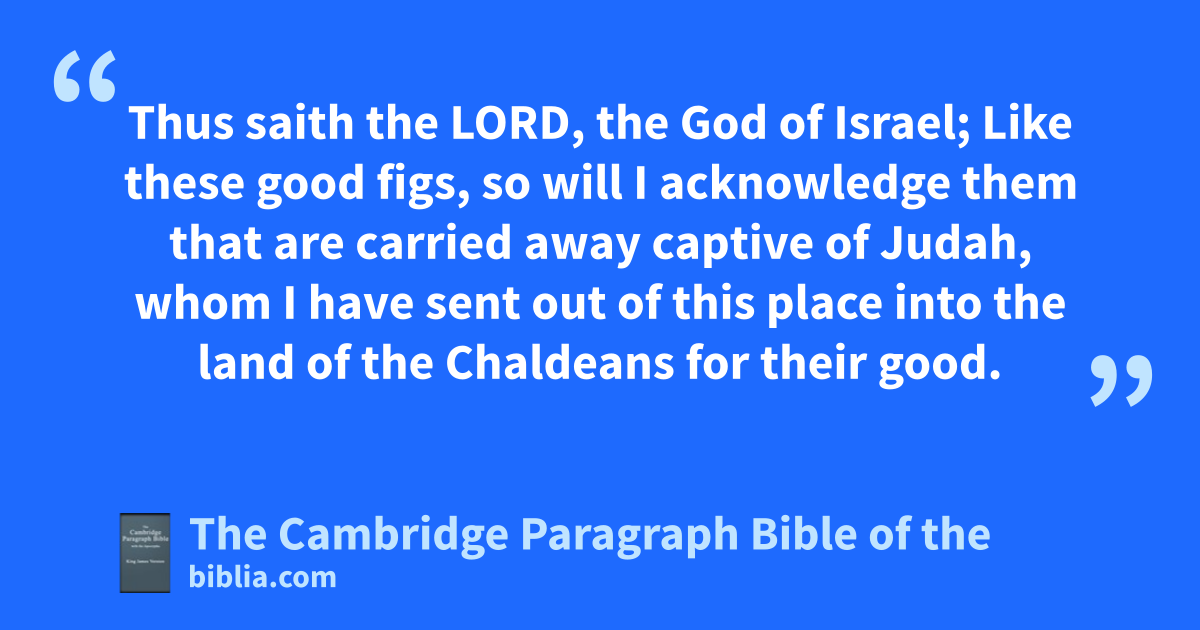 XXIV. * aThe Lord shewed me, and behold, two baskets of figs were set before the temple of the Lord, after that bNebuchadrezzar king of Babylon had carried away captive cJeconiah the son of Jehoiakim king of Judah, and dthe princes of Judah, with dethe carpenters and dsmiths, from Jerusalem, and had brought them to Babylon. 2 One basket had very good figs, even like the figs that are ffirst ripe: and the other basket had ffvery naughty figs, which could not be eaten, * they were so bad. 3 Then said the Lord unto me, What seest thou, Jeremiah? And I said, Figs; the good figs, very good; and the evil, very evil, that cannot be eaten, they are so evil. 4 Again the word of the Lord came unto me, saying, 5 Thus saith the Lord, the God of Israel; Like these good figs, so will I acknowledge * them that are carried away captive of Judah, gwhom I have sent out of this place into the land of the Chaldeans hfor their good. 6 For I will ggset mine eyes upon them hfor good, and iI will bring them again to this land: and klI will build them, and not pull them down; kand mI will plant them, and not pluck them up. 7 And nI will give them a heart to know me, that I am the Lord: and othey shall be my people, and I will be their God: for they shall return unto me pwith their whole heart. 8 And as ffthe evil figs, which cannot be eaten, they are so evil; surely thus saith the Lord, So will I give qZedekiah the king of Judah, and his princes, and the residue of Jerusalem, that remain in this land, and rthem that dwell in the land of Egypt: 9 and I will deliver them * uto be removed into all the kingdoms of the earth for their hurt, vto be a reproach and wa proverb, wa taunt and a xcurse, in all places whither I shall drive them. 10 And yI will send zthe sword, zthe famine, and the pestilence, among them, till they be consumed from off the land that I gave unto them and to their fathers.