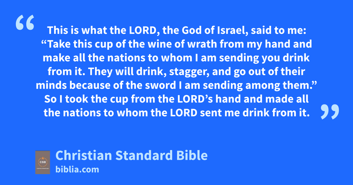 15 This is what the Lord, the God of Israel, said to me: “Take this cup of the wine of wrath from my hand and make all the nations to whom I am sending you drink from it.c 16 They will drink, stagger,A and go out of their minds because of the sword I am sending among them.”d