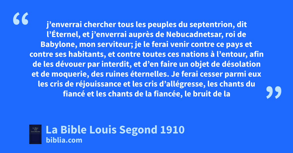 1La parole fut adressée à Jérémie sur tout le peuple de Juda, la quatrième année de Jojakim, fils de Josias, roi de Juda, — c’était la première année de Nebucadnetsar, roi de Babylone, — 2parole que Jérémie prononça devant tout le peuple de Juda et devant tous les habitants de Jérusalem, en disant: 3Depuis la treizième année de Josias, fils d’Amon, roi de Juda, il y a vingt-trois ans que la parole de l’Éternel m’a été adressée; je vous ai parlé, je vous ai parlé dès le matin, et vous n’avez pas écouté. 4L’Éternel vous a envoyé tous ses serviteurs, les prophètes, il les a envoyés adès le matin; et vous bn’avez pas écouté, vous n’avez pas prêté l’oreille pour écouter. 5Ils ont dit: cRevenez chacun de votre mauvaise voie et de la méchanceté de vos actions, et vous resterez dans le pays que j’ai donné à vous et à vos pères, d’éternité en éternité; 6n’allez pas après d’autres dieux, pour les servir et pour vous prosterner devant eux, ne m’irritez pas par l’ouvrage de vos mains, et je ne vous ferai aucun mal. 7Mais vous ne m’avez pas écouté, dit l’Éternel, afin de m’irriter par l’ouvrage de vos mains, pour votre malheur. 8C’est pourquoi ainsi parle l’Éternel des armées: Parce que vous n’avez point écouté mes paroles, 9j’enverrai chercher tous les peuples du septentrion, dit l’Éternel, et j’enverrai auprès de Nebucadnetsar, roi de Babylone, mon serviteur; je le ferai venir contre ce pays et contre ses habitants, et contre toutes ces nations à l’entour, afin de les dévouer par interdit, et d’en faire un objet de désolation et de dmoquerie, des ruines éternelles. 10Je ferai cesser parmi eux eles cris de réjouissance et les cris d’allégresse, les chants du fiancé et les chants de la fiancée, le bruit de la meule et la lumière de la lampe. 11Tout ce pays deviendra une ruine, un désert, et ces nations seront asservies au roi de Babylone pendant soixante-dix ans. 12Mais lorsque ces fsoixante-dix ans seront accomplis, je châtierai le roi de Babylone et cette nation, dit l’Éternel, à cause de leurs iniquités; je punirai le pays des Chaldéens, et j’en ferai des ruines éternelles. 13Je ferai venir sur ce pays toutes les choses que j’ai annoncées sur lui, tout ce qui est écrit dans ce livre, ce que Jérémie a prophétisé sur toutes les nations. 14gCar des nations puissantes et de grands rois les asserviront, eux aussi, et je leur rendrai selon leurs oeuvres et selon l’ouvrage de leurs mains.