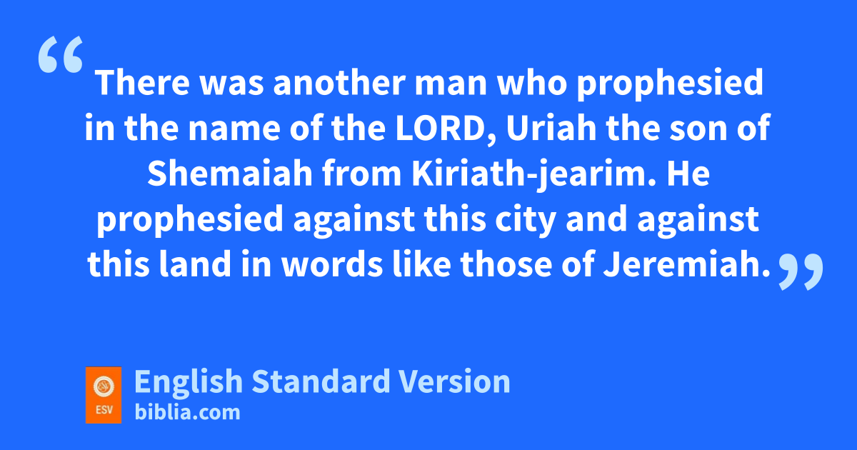 20 There was another man who prophesied in the name of the Lord, Uriah the son of Shemaiah from wKiriath-jearim. He prophesied against this city and against this land in words like those of Jeremiah. 21 And when xKing Jehoiakim, with all his warriors and all the officials, heard his words, the king sought to put him to death. But when Uriah heard of it, he was afraid and fled and escaped to Egypt. 22 Then xKing Jehoiakim sent to Egypt certain men, yElnathan the son of zAchbor and others with him, 23 and they took Uriah from Egypt and brought him to King Jehoiakim, awho struck him down with the sword and dumped his dead body into the burial place of the common people.