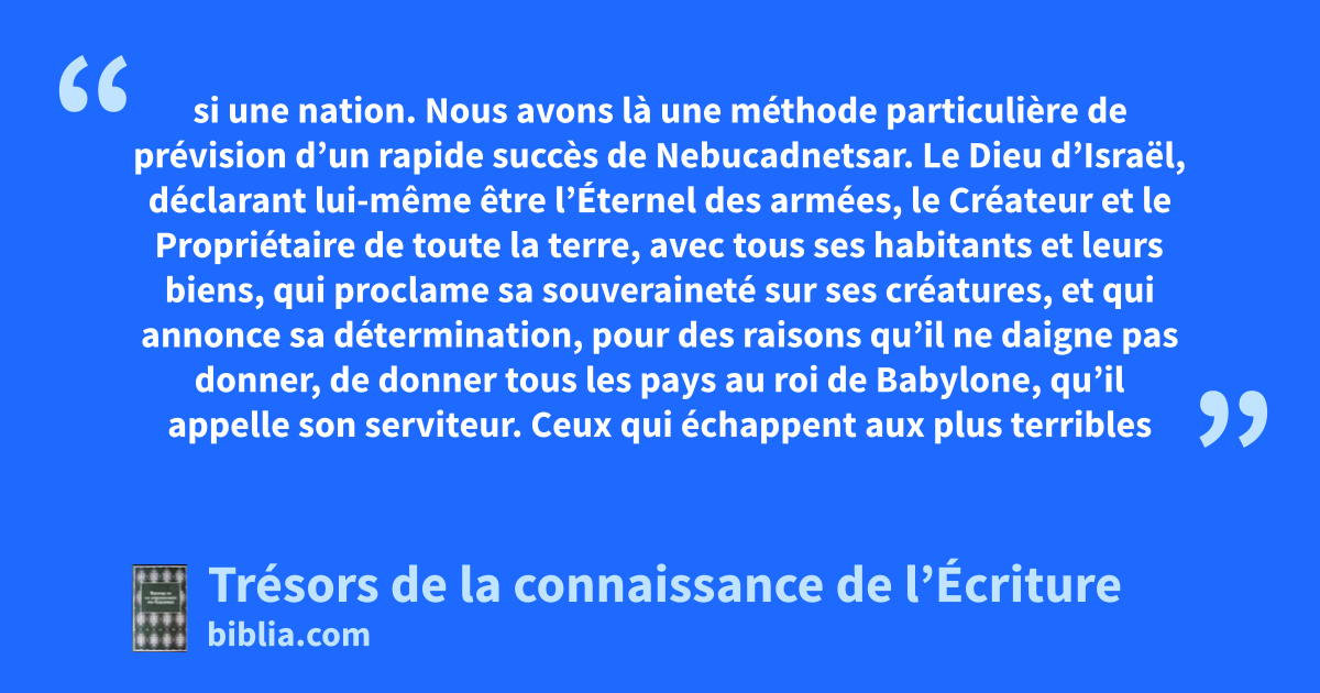 si une nation. Nous avons là une méthode particulière de prévision d’un rapide succès de Nebucadnetsar. Le Dieu d’Israël, déclarant lui-même être l’Éternel des armées, le Créateur et le Propriétaire de toute la terre, avec tous ses habitants et leurs biens, qui proclame sa souveraineté sur ses créatures, et qui annonce sa détermination, pour des raisons qu’il ne daigne pas donner, de donner tous les pays au roi de Babylone, qu’il appelle son serviteur. Ceux qui échappent aux plus terribles jugements sont soumis au Dieu d’Israël, en se soumettant à Nebucadnetsar. Ils doivent écouter les prophètes d’Israël et non leurs propres devins, et se rendre compte que Nebucadnetsar, son fils, et son petit fils ont tous les droits sur eux et leurs pays, jusqu’à ce que le temps fixé soit arrivé. A ce moment-là, leurs maîtres orgueilleux deviendront la proie à leur tour d’autres puissants conquérants. Tout ceci s’est exactement accompli. cette nation. 25.28, 29; 38.17-19; 40.9; 42.10-18; 52.3-6; Ez 17.19-21 par l’épée. 24.10; Ez 14.21