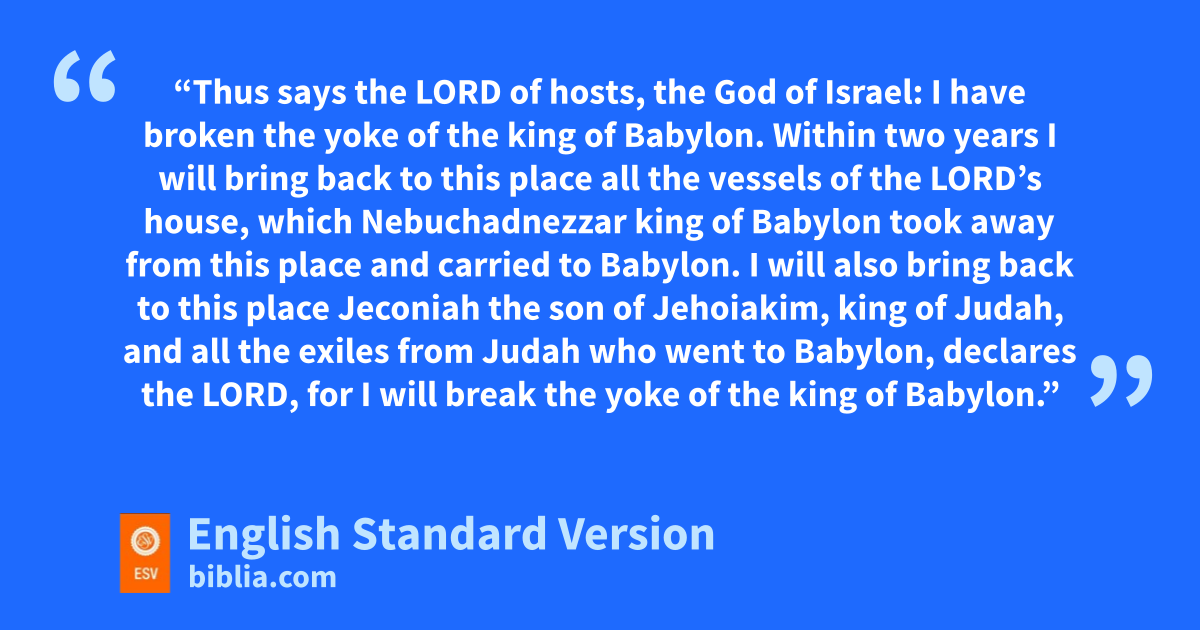 28 In that same year, at the beginning of the reign of nZedekiah king of Judah, in the fifth month of the fourth year, Hananiah the son of oAzzur, the prophet from pGibeon, spoke to me in the house of the Lord, in the presence of the priests and all the people, saying, 2 “Thus says the Lord of hosts, the God of Israel: qI have broken the yoke of the king of Babylon. 3 rWithin stwo years I will bring back to this place all the vessels of the Lord’s house, which Nebuchadnezzar king of Babylon took away from this place and carried to Babylon. 4 I will also bring back to this place tJeconiah the son of Jehoiakim, king of Judah, and all the exiles from Judah who went to Babylon, declares the Lord, qfor I will break the yoke of the king of Babylon.”