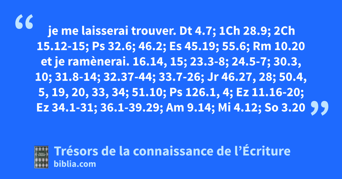 je me laisserai trouver. Dt 4.7; 1Ch 28.9; 2Ch 15.12-15; Ps 32.6; 46.2; Es 45.19; 55.6; Rm 10.20 et je ramènerai. 16.14, 15; 23.3-8; 24.5-7; 30.3, 10; 31.8-14; 32.37-44; 33.7-26; Jr 46.27, 28; 50.4, 5, 19, 20, 33, 34; 51.10; Ps 126.1, 4; Ez 11.16-20; Ez 34.1-31; 36.1-39.29; Am 9.14; Mi 4.12; So 3.20