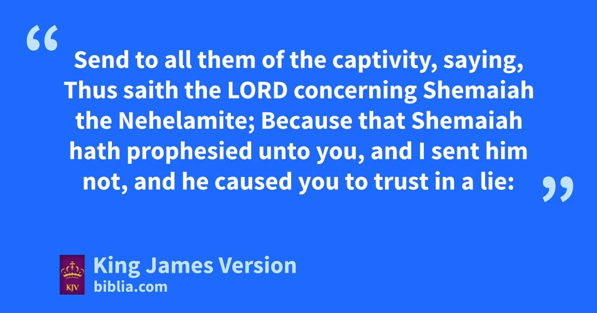 24 *Thus shalt thou also speak to Shemaiah the ||Nehelamite, saying, 25 Thus speaketh the Lord of hosts, the God of Israel, saying, Because thou hast sent letters in thy name unto all the people that are at Jerusalem, and to uZephaniah the son of uuMaaseiah the priest, and to all the priests, saying, 26 The Lord hath made thee priest in the stead of vJehoiada the priest, that ye should be wofficers in the house of the Lord, for every man xthat is mad, and ymaketh himself a prophet, that thou shouldest put him in prison, and in zthe stocks. 27 Now therefore why hast thou not reproved aJeremiah of Anathoth, ywhich maketh himself a prophet to you? 28 For therefore he sent unto us in Babylon, saying, This captivity is long: bbuild ye houses, and dwell in them; and plant gardens, and eat the fruit of them. 29 And Zephaniah the priest read this letter in the ears of Jeremiah the prophet. 30 Then came the word of the Lord unto Jeremiah, saying, 31 Send to all them of the captivity, saying, Thus saith the Lord concerning Shemaiah the Nehelamite; Because that Shemaiah hath prophesied unto you, and cdI sent him not, and che caused you to trust in a lie: 32 Therefore thus saith the Lord; Behold, I will punish Shemaiah the Nehelamite, and his seed: he shall not have a man to dwell among this people; neither eshall he behold the good that I will do for my people, saith the Lord; fbecause he hath taught †rebellion against the Lord.