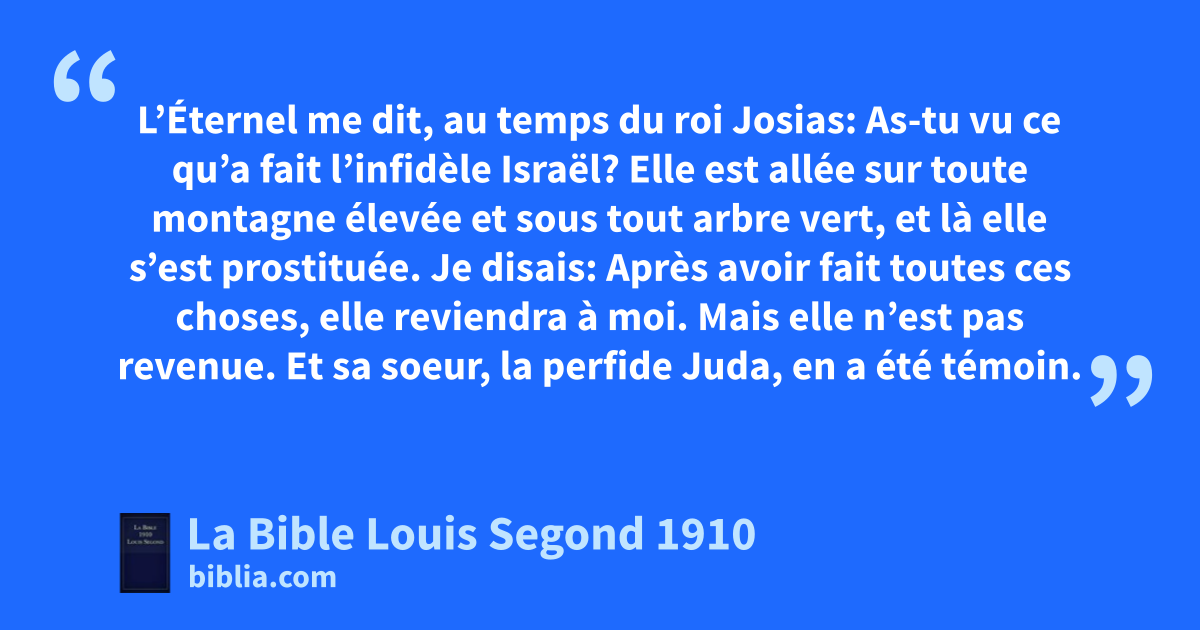 6L’Éternel me dit, au temps du roi Josias: As-tu vu ce qu’a fait l’infidèle Israël? aElle est allée sur toute montagne élevée et sous tout arbre vert, et là elle s’est prostituée. 7Je disais: Après avoir fait toutes ces choses, elle reviendra à moi. Mais elle n’est pas revenue. Et sa soeur, la perfide Juda, en a été témoin. 8Quoique j’eusse répudié l’infidèle Israël à cause de tous ses adultères, et que je lui eusse donné sa lettre de divorce, j’ai vu que la perfide Juda, sa soeur, n’a point eu de crainte, et qu’elle est allée se prostituer pareillement. 9Par sa criante impudicité Israël a souillé le pays, elle a commis un adultère avec la pierre et le bois. 10Malgré tout cela, la perfide Juda, sa soeur, n’est pas revenue à moi de tout son coeur; c’est avec fausseté qu’elle l’a fait, dit l’Éternel.