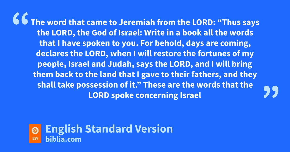 30 The word that came to Jeremiah from the Lord: 2 “Thus says the Lord, the God of Israel: eWrite in a book all the words that I have spoken to you. 3 fFor behold, days are coming, declares the Lord, gwhen I will restore hthe fortunes of my people, iIsrael and Judah, says the Lord, jand I will bring them back to the land that I gave to their fathers, and they shall take possession of it.”