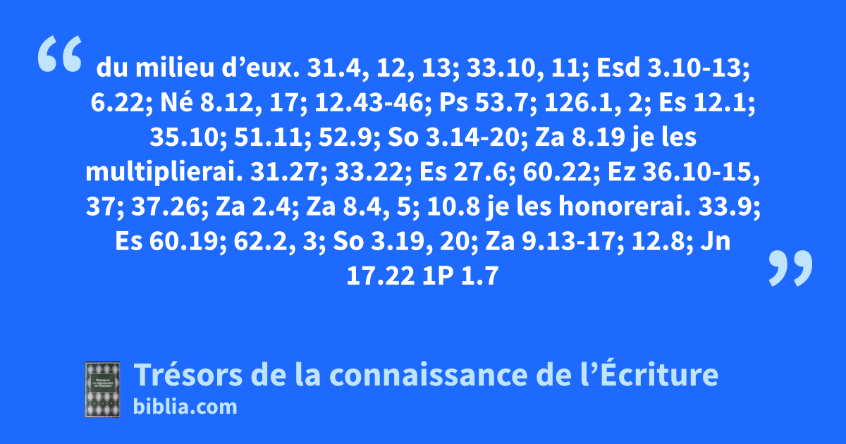 du milieu d’eux. 31.4, 12, 13; 33.10, 11; Esd 3.10-13; 6.22; Né 8.12, 17; 12.43-46; Ps 53.7; 126.1, 2; Es 12.1; 35.10; 51.11; 52.9; So 3.14-20; Za 8.19 je les multiplierai. 31.27; 33.22; Es 27.6; 60.22; Ez 36.10-15, 37; 37.26; Za 2.4; Za 8.4, 5; 10.8 je les honorerai. 33.9; Es 60.19; 62.2, 3; So 3.19, 20; Za 9.13-17; 12.8; Jn 17.22 1P 1.7