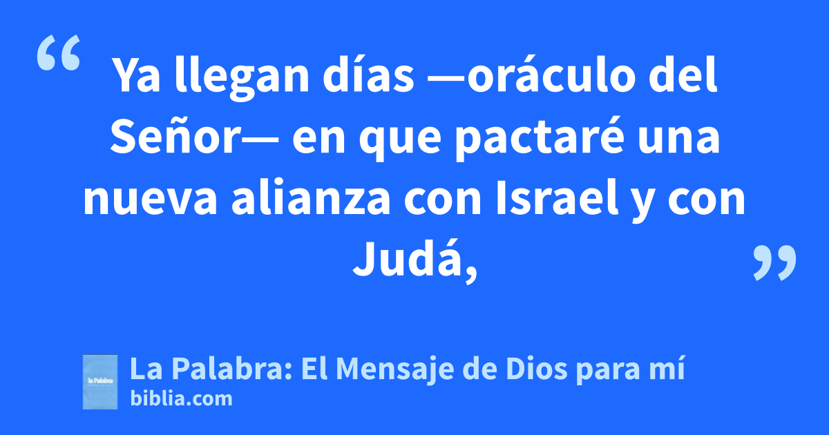 31 Ya llegan días —oráculo del Señor— en que pactaré una nueva alianza con Israel y con Judá, 32 no como la alianza que pacté con sus antepasados el día que los tomé de la mano para sacarlos del país de Egipto: ellos quebrantaron mi alianza, aunque yo los había desposado —oráculo del Señor—. 33 Esta es la alianza que voy a pactar con Israel después de aquellos días —oráculo del Señor—: Pondré mi ley en su interior, la escribiré en sus corazones y yo seré su Dios y ellos serán mi pueblo. 34 Nadie enseñará a nadie diciendo: “Conozcan al Señor”, porque todos me conocerán, del más pequeño al más grande —oráculo del Señor—; perdonaré sus culpas y ya no me acordaré de sus pecados.