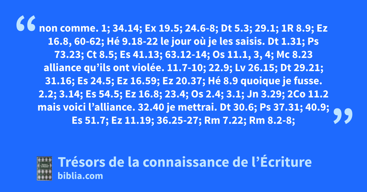 non comme. 1; 34.14; Ex 19.5; 24.6-8; Dt 5.3; 29.1; 1R 8.9; Ez 16.8, 60-62; Hé 9.18-22 le jour où je les saisis. Dt 1.31; Ps 73.23; Ct 8.5; Es 41.13; 63.12-14; Os 11.1, 3, 4; Mc 8.23 alliance qu’ils ont violée. 11.7-10; 22.9; Lv 26.15; Dt 29.21; 31.16; Es 24.5; Ez 16.59; Ez 20.37; Hé 8.9 quoique je fusse. 2.2; 3.14; Es 54.5; Ez 16.8; 23.4; Os 2.4; 3.1; Jn 3.29; 2Co 11.2