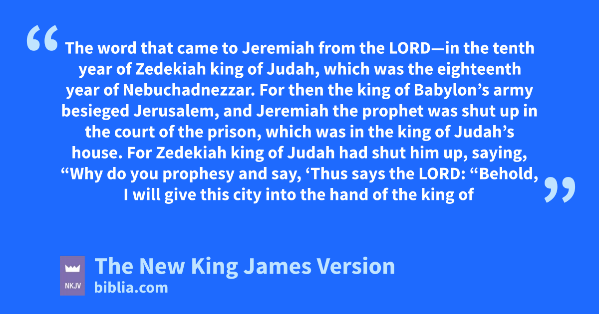 32 The word that came to Jeremiah from the Lord—ain the tenth year of Zedekiah king of Judah, which was the eighteenth year of Nebuchadnezzar. 2 For then the king of Babylon’s army besieged Jerusalem, and Jeremiah the prophet was shut up bin the court of the prison, which was in the king of Judah’s house. 3 For Zedekiah king of Judah had shut him up, saying, “Why do you cprophesy and say, ‘Thus says the Lord: d“Behold, I will give this city into the hand of the king of Babylon, and he shall take it; 4 and Zedekiah king of Judah eshall not escape from the hand of the Chaldeans, but shall surely be delivered into the hand of the king of Babylon, and shall speak with him 1face to face, and see him feye to eye; 5 then he shall glead Zedekiah to Babylon, and there he shall be huntil I visit him,” says the Lord; i“though you fight with the Chaldeans, you shall not succeed” ’?”