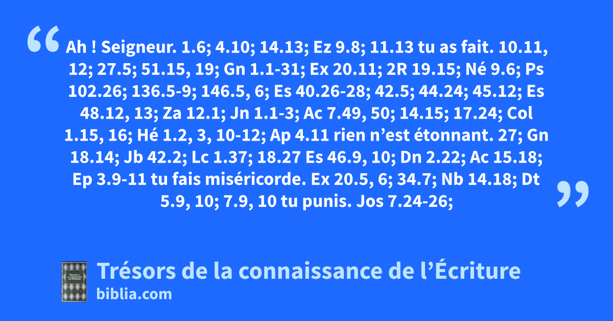 Ah ! Seigneur. 1.6; 4.10; 14.13; Ez 9.8; 11.13 tu as fait. 10.11, 12; 27.5; 51.15, 19; Gn 1.1-31; Ex 20.11; 2R 19.15; Né 9.6; Ps 102.26; 136.5-9; 146.5, 6; Es 40.26-28; 42.5; 44.24; 45.12; Es 48.12, 13; Za 12.1; Jn 1.1-3; Ac 7.49, 50; 14.15; 17.24; Col 1.15, 16; Hé 1.2, 3, 10-12; Ap 4.11 rien n’est étonnant. 27; Gn 18.14; Jb 42.2; Lc 1.37; 18.27 Es 46.9, 10; Dn 2.22; Ac 15.18; Ep 3.9-11