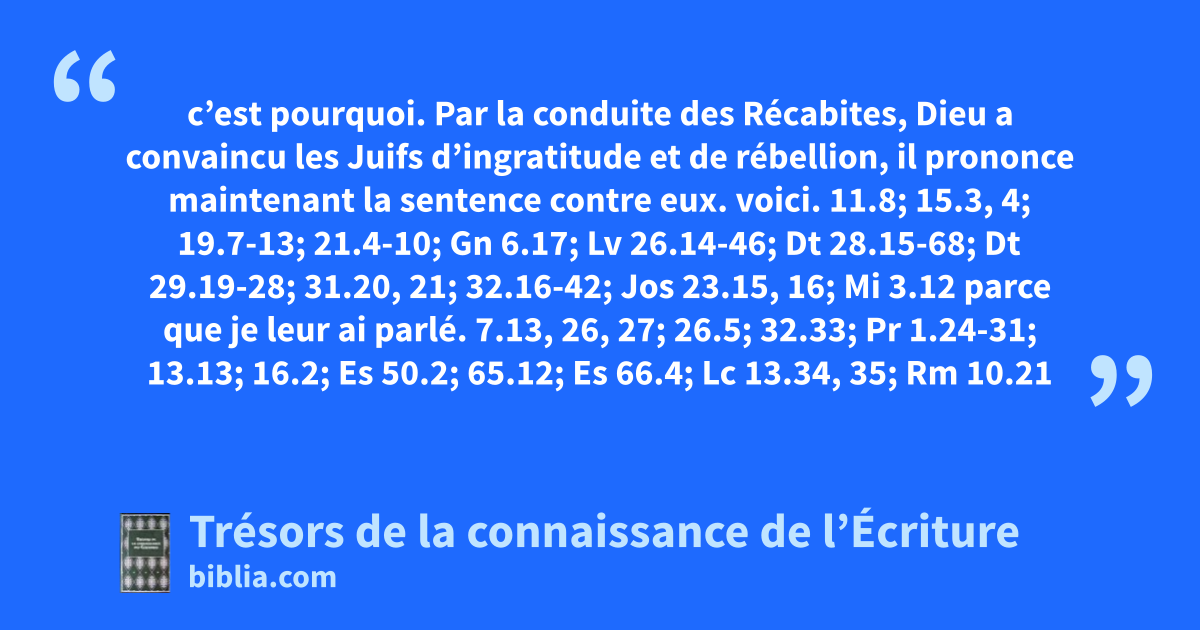 c’est pourquoi. Par la conduite des Récabites, Dieu a convaincu les Juifs d’ingratitude et de rébellion, il prononce maintenant la sentence contre eux. voici. 11.8; 15.3, 4; 19.7-13; 21.4-10; Gn 6.17; Lv 26.14-46; Dt 28.15-68; Dt 29.19-28; 31.20, 21; 32.16-42; Jos 23.15, 16; Mi 3.12 parce que je leur ai parlé. 7.13, 26, 27; 26.5; 32.33; Pr 1.24-31; 13.13; 16.2; Es 50.2; 65.12; Es 66.4; Lc 13.34, 35; Rm 10.21