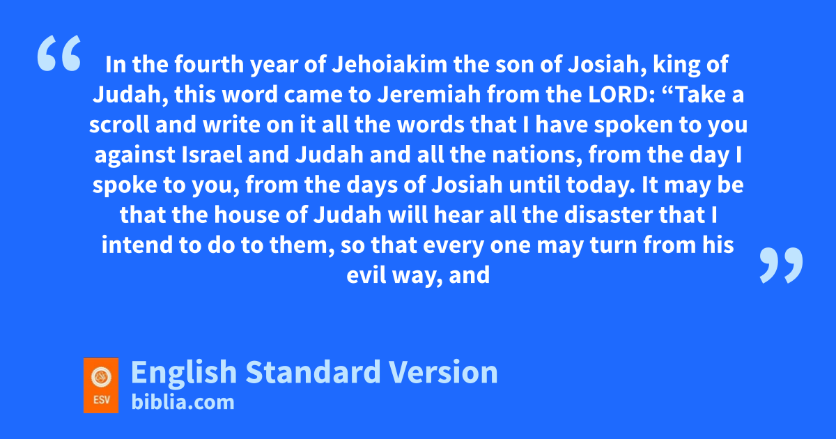 36 In the ffourth year of Jehoiakim the son of Josiah, king of Judah, this word came to Jeremiah from the Lord: 2 “Take ga scroll and hwrite on it all the words that I have spoken to you against Israel and iJudah jand all the nations, kfrom the day I spoke to you, from the days of Josiah until today. 3 lIt may be that the house of Judah will hear all the disaster that I intend to do to them, mso that every one may turn from his evil way, and nthat I may forgive their iniquity and their sin.”