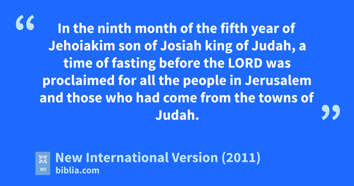 4 So Jeremiah called Baruchq son of Neriah,r and while Jeremiah dictateds all the words the Lord had spoken to him, Baruch wrote them on the scroll.t 5 Then Jeremiah told Baruch, “I am restricted; I am not allowed to go to the Lord’s temple. 6 So you go to the house of the Lord on a day of fastingu and read to the people from the scroll the words of the Lord that you wrote as I dictated.v Read them to all the people of Judahw who come in from their towns. 7 Perhaps they will bring their petitionx before the Lord and will each turny from their wicked ways, for the angerz and wrath pronounced against this people by the Lord are great.”