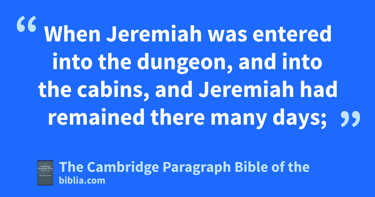 16 * When Jeremiah was entered into bthe dungeon, and into the * cabins, and Jeremiah had remained there many days; 17 then Zedekiah the king sent, and ctook him out: and the king asked him dsecretly in his house, and said, Is there any word from the Lord? And Jeremiah said, There is: for, said he, ethou shalt be delivered into the hand of the king of Babylon. 18 Moreover Jeremiah said unto king Zedekiah, What have I offended against thee, or against thy servants, or against this people, that ye have put me in prison? 19 fWhere are now your prophets which prophesied unto you, saying, The king of Babylon shall not come against you, nor against this land? 20 Therefore hear now, I pray thee, O my lord the king: * glet my supplication, I pray thee, be accepted before thee, gthat thou cause me not to return to athe house of Jonathan the scribe, lest I die there. 21 Then Zedekiah the king commanded that they should commit Jeremiah hinto the court of the prison, and that they should give him daily ia piece of bread out of the bakers’ street, kuntil all the bread in the city were spent. Thus Jeremiah remained hin the court of the prison.