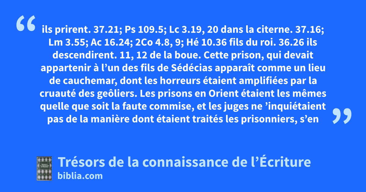 ils prirent. 37.21; Ps 109.5; Lc 3.19, 20 dans la citerne. 37.16; Lm 3.55; Ac 16.24; 2Co 4.8, 9; Hé 10.36 fils du roi. 36.26 ils descendirent. 11, 12 de la boue. Cette prison, qui devait appartenir à l’un des fils de Sédécias apparaît comme un lieu de cauchemar, dont les horreurs étaient amplifiées par la cruauté des geôliers. Les prisons en Orient étaient les mêmes quelle que soit la faute commise, et les juges ne ’inquiétaient pas de la manière dont étaient traités les prisonniers, s’en remettant aux geôliers qui faisaient ce qu’ils voulaient, et qui savaient donner le plus meilleur des conforts au plus grand des criminels, si celui-ci pouvait payer ce confort. Par contre, si le geôlier était payé par ceux qui demandaient l’emprisonnement, le prisonnier était traité avec la plus grande cruauté. Selon le bon vouloir du geôlier, le prisonnier pouvait être confiné, ou recevoir des visites. On comprend les souffrances de Jérémie et sa demande de ne plus retourner à la maison de Jonathan. 26; 37.20; 22; Gn 37.24; Ps 40.3; 69.3, 15, 16; Lm 3.52-55; Za 9.11