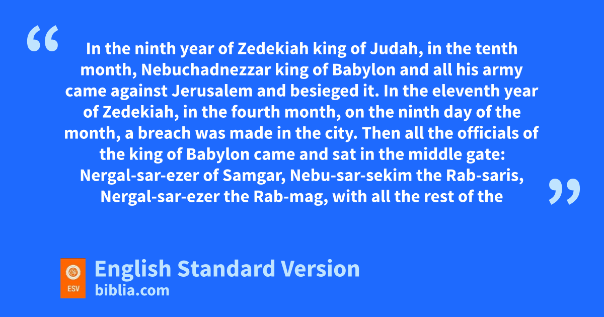 39 nIn the ninth year of Zedekiah king of Judah, in the tenth month, Nebuchadnezzar king of Babylon and all his army came against Jerusalem and besieged it. 2 In the eleventh year of Zedekiah, in the fourth month, on the ninth day of the month, a breach was made in the city. 3 Then all othe officials of the king of Babylon came pand sat in the middle gate: Nergal-sar-ezer of Samgar, Nebu-sar-sekim qthe Rab-saris, Nergal-sar-ezer the Rab-mag, with all the rest of the officers of the king of Babylon. 4 When Zedekiah king of Judah and all the soldiers saw them, they fled, going out of the city at night by way of the king’s garden through the gate between the two walls; and they went toward rthe Arabah. 5 But the army of the Chaldeans pursued them and overtook Zedekiah in sthe plains of Jericho. And when they had taken him, they brought him up to Nebuchadnezzar king of Babylon, at tRiblah, in the land of Hamath; uand he passed sentence on him. 6 The king of Babylon vslaughtered the sons of Zedekiah at tRiblah before his eyes, and the king of Babylon vslaughtered all the nobles of Judah. 7 wHe put out the eyes of Zedekiah and bound him in chains to take him to Babylon. 8 xThe Chaldeans burned the king’s house and the house of the people, yand broke down the walls of Jerusalem. 9 Then zNebuzaradan, the acaptain of the guard, carried into exile to Babylon the rest of the people who were left in the city, bthose who had deserted to him, and the people who remained. 10 Nebuzaradan, the captain of the guard, cleft in the land of Judah some of the poor people who owned nothing, and gave them vineyards and fields at the same time.