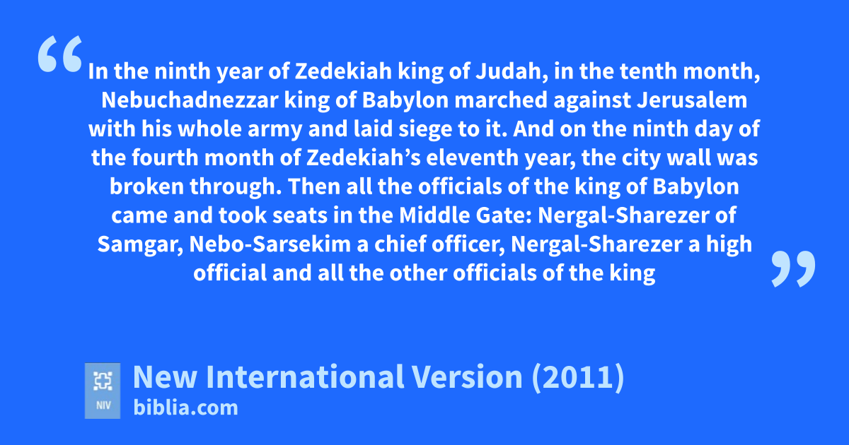 39 In the ninth year of Zedekiahw king of Judah, in the tenth month, Nebuchadnezzarx king of Babylon marched against Jerusalem with his whole army and laid siegey to it. 2 And on the ninth day of the fourthz month of Zedekiah’s eleventh year, the city walla was broken through.b 3 Then all the officialsc of the king of Babylon came and took seats in the Middle Gate: Nergal-Sharezer of Samgar, Nebo-Sarsekim a chief officer, Nergal-Sharezer a high official and all the other officials of the king of Babylon. 4 When Zedekiah king of Judah and all the soldiers saw them, they fled; they left the city at night by way of the king’s garden, through the gate between the two walls,d and headed toward the Arabah.a e