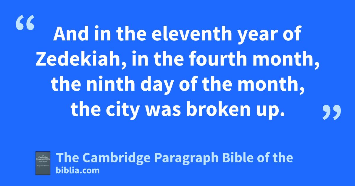 XXXIX. * aIn the ninth year of Zedekiah king of Judah, in the tenth month, came Nebuchadrezzar king of Babylon and all his army against Jerusalem, and they besieged it. 2 * And in the eleventh year of Zedekiah, in the fourth month, the ninth day of the month, the city was broken up. 3 And ball the princes of the king of Babylon came in, and csat in the middle gate, even Nergal-sharezer, Samgar-nebo, Sarsechim, dRab-saris, Nergal-sharezer, eRab-mag, with all the residue of the princes of the king of Babylon. 4 And it came to pass, that fwhen Zedekiah the king of Judah saw them, and all the men of war, then they fled, and went forth out of the city by night, by the way of the king’s garden, by the gate betwixt the two walls: and he went out the way of the plain. 5 But the Chaldeans’ army pursued after them, and overtook Zedekiah in the plains of Jericho: and when they had taken him, they brought him up to Nebuchadnezzar king of Babylon to gRiblah in the land of Hamath, where hhe * gave judgment upon him. 6 Then the king of Babylon slew ithe sons of Zedekiah in Riblah before his eyes: kalso the king of Babylon slew all the nobles of Judah. 7 Moreover he lput out Zedekiah’s eyes, and bound him * with chains to carry him to Babylon.